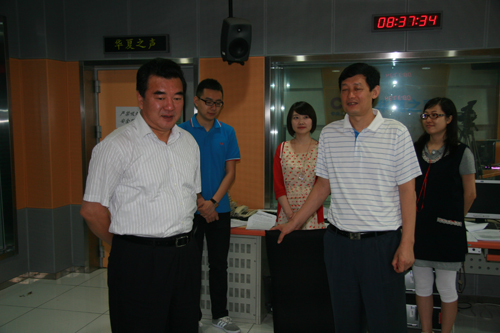 王求臺長(左一)視察直播間,華夏之聲總監(jiān)韓長江(右二)介紹直播流程。