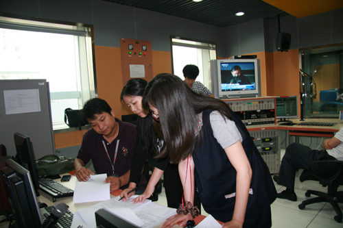 華夏之聲副總監(jiān)胡翼(左一)認(rèn)真核對節(jié)目流程