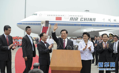 新華網(wǎng)香港6月29日電 中共中央總書記、國(guó)家主席、中央軍委主席胡錦濤29日中午乘專機(jī)抵達(dá)香港,將出席慶祝香港回歸祖國(guó)15周年大會(huì)暨香港特別行政區(qū)第四屆政府就職典禮。