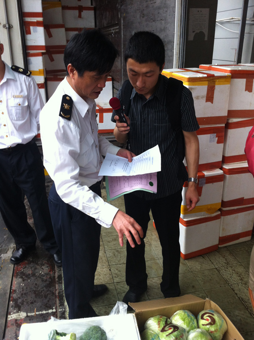 華夏之聲記者李鵬飛(右一)采訪供港澳蔬菜過(guò)關(guān)