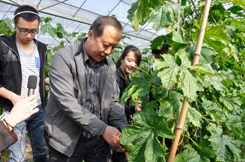 中央人民廣播電臺(tái)副臺(tái)長(zhǎng)趙鐵騎(左二)在黃陂供港蔬菜大棚中走訪