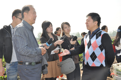 中央人民廣播電臺(tái)副臺(tái)長(zhǎng)趙鐵騎(左二)在黃陂供港蔬菜基地詢問(wèn)蔬菜的種植情況
