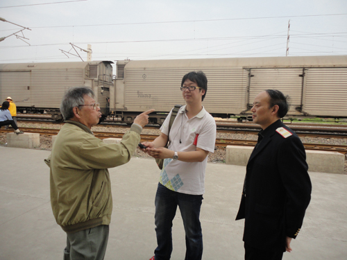 湖北武漢江岸車站原貨運(yùn)主任邢慶文(左一)向華夏之聲記者介紹當(dāng)年供港物資裝車情況