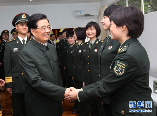 胡錦濤主席與女兵親切握手。新華社記者劉衛(wèi)兵攝