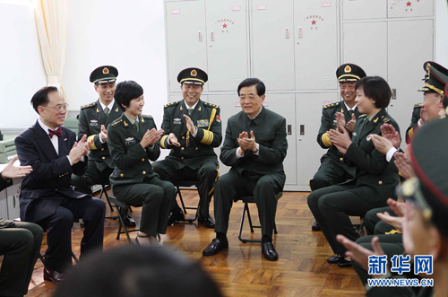 6月29日,中共中央總書記、國家主席、中央軍委主席胡錦濤在香港石崗軍營檢閱駐港部隊后,到機務站看望官兵。