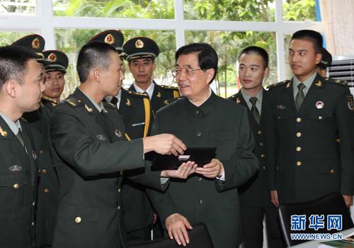 胡錦濤主席在圖書閱覽室與士兵親切交談,詢問他們的生活學習情況