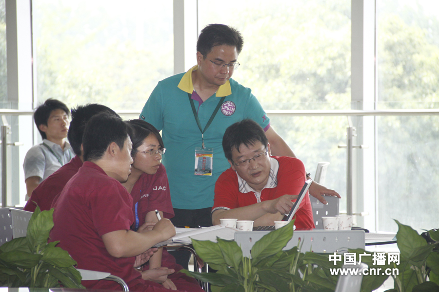 5月28日中央臺《傾聽安徽》報道組來到安徽江淮汽車股份有限公司采訪,記者趙子忠實地了解感受新能源汽車的發(fā)展和未來。圖為江淮汽車員工在休息區(qū)討論業(yè)務(wù)。(中廣網(wǎng)記者劉夢 攝)