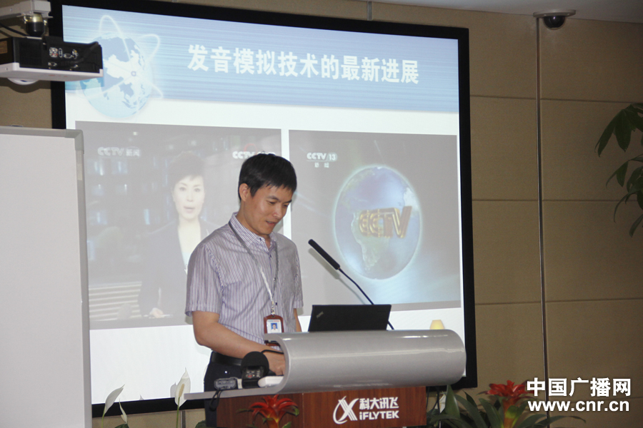5月28日中央臺《傾聽安徽》報道組來到安徽科大訊飛科技股份有限公司采訪,記者趙子忠實地了解感受智能語音技術(shù)的發(fā)展和未來。圖為安徽科大訊飛副總經(jīng)理吳曉如介紹智能語音技術(shù)的最新發(fā)展(中廣網(wǎng)記者劉夢 攝)