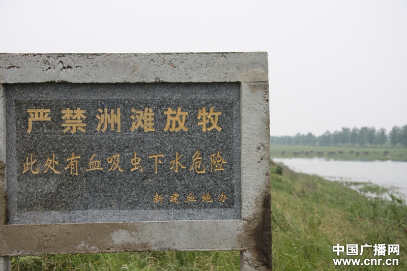 在湖堤“嚴(yán)禁洲灘放牧”石碑的后面仍然能看到散放的牛(中廣網(wǎng)記者 范存寶攝)