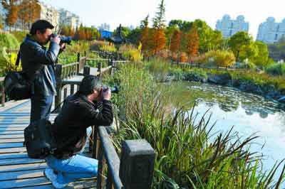 兩名攝影愛好者在徐匯區(qū)康健公園一塊面積近兩千平方米的人工生態(tài)濕地內(nèi)拍照。
