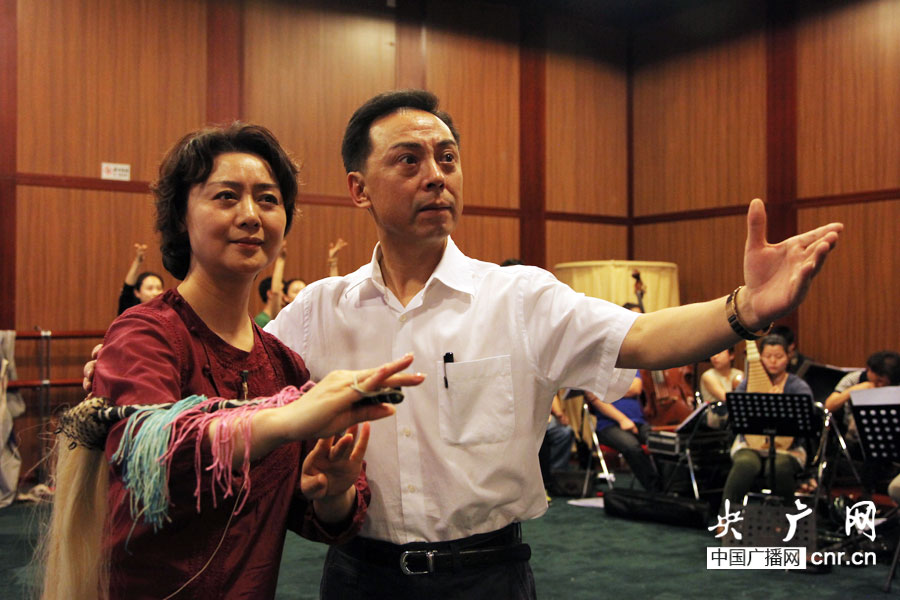 京劇表演藝術(shù)家于魁智、李勝素正在排練當中(央廣網(wǎng)記者 趙娜娜 攝 )