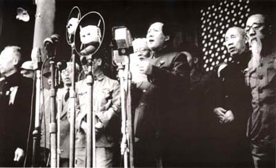 聚集在天安門廣場(chǎng)的三十萬軍民沸騰了,這些在早上六點(diǎn)來到這里的工人、農(nóng)民、人民解放軍知識(shí)分子和北京市民終于等到了這一激動(dòng)人心的時(shí)刻。站在天安門城樓上的,是那些為新中國(guó)成立做出重大貢獻(xiàn)的杰出人物,他們是剛剛當(dāng)選的中央人民政府主席毛澤東、副主席朱德、劉少奇、宋慶齡、李濟(jì)琛、張瀾和政務(wù)院總理兼外交部長(zhǎng)周恩來,還有功勛等卓著的元帥、將領(lǐng),還有馬寅初、郭沫若、傅作義等民主黨派和社會(huì)知名人士。