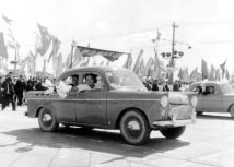 北京汽車制造廠生產(chǎn)的第一批北京牌和井岡山牌轎車,出現(xiàn)在1958年10月1日的國慶游行行列中