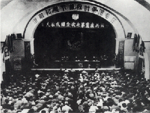 1945年4月23日至6月11日,中國共產(chǎn)黨第七次全國代表大會在延安楊家?guī)X中央大禮堂召開,歷時50天。出席大會的正式代表547名,候補代表208名,共計755名,代表全國121萬黨員。大會選出毛澤東、朱德、劉少奇、周恩來、任弼時、林伯渠、彭德懷、康生、陳云、陳毅、賀龍、徐向前、高崗、張聞天、彭真15人組成主席團,選舉任弼時為大會秘書長、李富春為副秘書長。