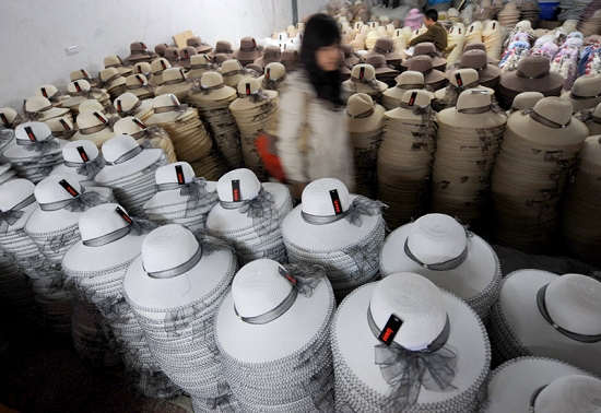 浙江省溫嶺市一家制帽廠剛剛制作完成的一批帽子準(zhǔn)備出口(4月10日攝)。
