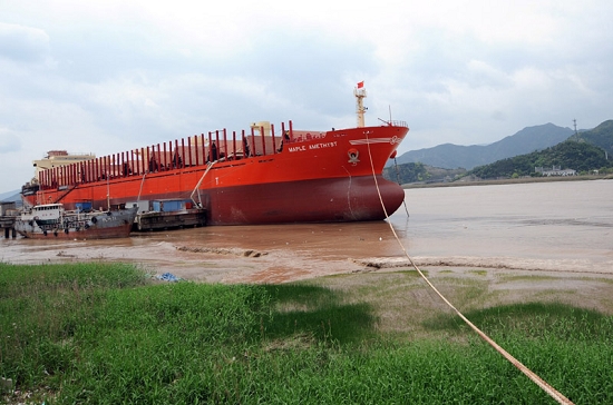 浙江省臨海市一家造船廠剛剛完工下水的一艘大船,準(zhǔn)備交付給丹麥船東(4月11日攝)。