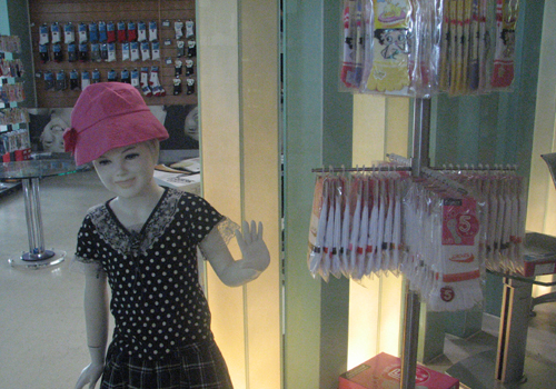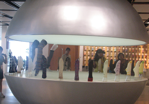 夢(mèng)娜偌大的陳列室里,展示了門(mén)類齊全的各種男式、女式、兒童、長(zhǎng)襪、短襪、棉紗、絲襪,通過(guò)精心的陳設(shè)讓這里成為其品牌認(rèn)同的另一個(gè)窗口,每月工廠接待工業(yè)旅游參觀3萬(wàn)人次,直接讓外人了解生產(chǎn)襪子是怎么做的,用什么做的。