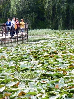 湖心島北面的玉帶橋由8塊長方形橋板按“Z”字形組合而成,如一條菱形的玉帶鑲嵌在湖中,連接湖心島和柳堤。柳堤直通湖岸的回廊,堤兩側(cè)的楊柳樹下有供休憩和垂釣的石凳,閑暇時或漫步柳岸或垂釣樹下,微風徐來,千條柳枝隨風飄舞,別有一番風味。蕭瑟的晚秋,湖面升騰的水氣在初生月光的照映下煙波浩渺,更有“楊柳岸曉風殘月”的凄清之美。柳堤中央有一座34根石雕立柱的平曲橋,橋孔較高,橋面弧度小,正面望去宛如一座水上城門。鴛鴦湖東面的水上步道獨具特色,從護欄到路面全由松木搭建而成。以此為界,公園東面是一片荷花塘,碧綠的海洋中一朵朵潔白的荷蓮亭亭玉立,風度翩翩。