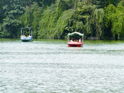 鳳池水域分為兩部分,西面是供游人游湖的“情侶灣”。藍天碧水,惠風和暢,泛舟其間,聆聽船槳和水花的協(xié)奏,讓人心曠神怡,悠然自得。水域東面是兩湖合一的“鴛鴦湖”,一前一后,相依相伴,仿佛是一對纏綿的鴛鴦。