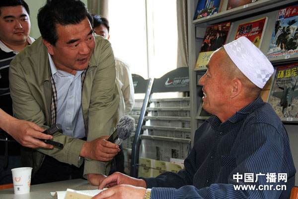 在烏魯木齊黑甲山片區(qū)社區(qū)閱覽室里,王求臺長采訪正在這里閱讀報刊的回族居民馬名學(xué)。(記者邱翔-攝)