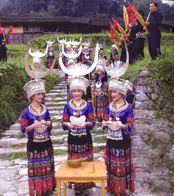 在黔東南自治州的苗鄉(xiāng)侗寨,有“無酒不成禮,無酒不成席”的規(guī)矩。家家都放有一兩壇自己用糯米釀造而成的米酒,約二三十度之間。酒俗,是苗侗人民民俗文化的重要組成部分,在節(jié)日常有報(bào)酒(祝酒)、敬酒、攔寨酒(雷山郎德12道攔寨酒)、攔門酒、迎客酒、送客酒。紅喜席,有嫁別酒、分家酒、換酒(交杯酒)、酒歌酒、訂親酒、賀兒酒。白喜席(如高齡老人過世等),有慰問酒、陪葬酒、酬勞酒、別魂酒、祭祀酒。日常席,有火堂酒、平伙酒(打平伙)。還有結(jié)盟議事時(shí)的歃血酒(血酒)、議榔酒。一般都用土碗作酒杯,逢重大節(jié)日和吉日,酒具改為牛角。
