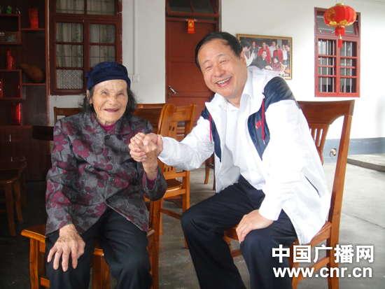 在上杭縣古田鎮(zhèn)五龍村,紅軍烈屬、百歲老人張?zhí)泼没貞浧?010年春節(jié)與胡錦濤總書記見面的場(chǎng)景,老人露出了歡心的微笑。