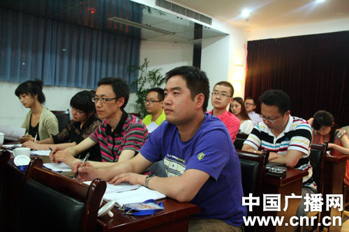 由中國廣播聯(lián)盟組織的“全國百家電臺攜手走轉(zhuǎn)改:我們在基層”赴四川“走基層、獻(xiàn)愛心”大型采訪活動5月8日在成都市啟動。圖中為各聯(lián)盟臺的記者正在認(rèn)真聆聽本次采訪活動的主題。中廣網(wǎng)記者李沛 攝