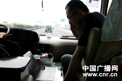 中國(guó)廣播聯(lián)盟組織“全國(guó)百家電臺(tái)攜手走轉(zhuǎn)改:我們?cè)诨鶎印备八拇ā白呋鶎印I(xiàn)愛心”大型采訪活動(dòng)。圖為5月9日8點(diǎn)22分中央臺(tái)經(jīng)濟(jì)之聲記者張子雨準(zhǔn)時(shí)進(jìn)行直播連線。(中廣網(wǎng)記者肖曉冬 攝)