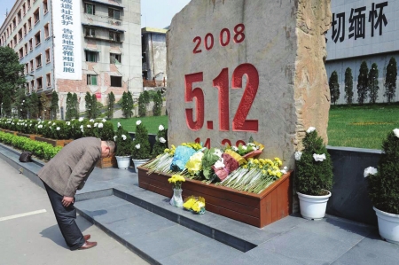 北川“5·12”地震紀念碑前,鞠躬表哀思。