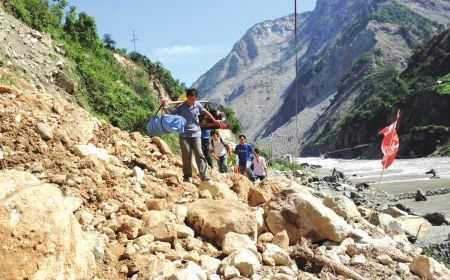 地震后都汶路損毀,受災(zāi)群眾只能徒步走出汶川資料圖片