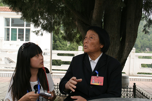 綿陽(yáng)臺(tái)記者蒲雨(左一)采訪全國(guó)勞模申紀(jì)蘭