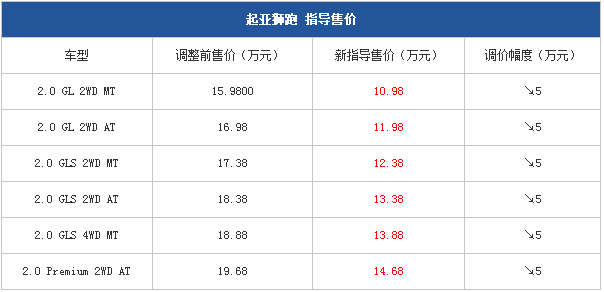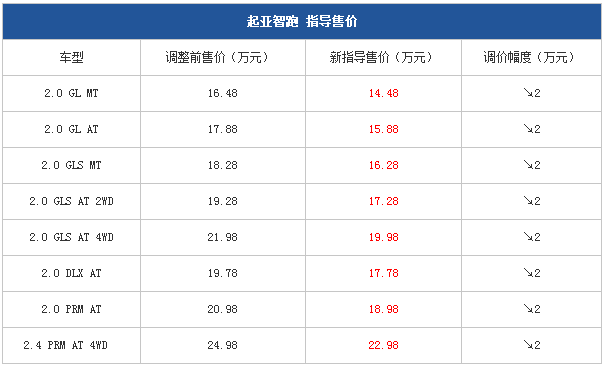 起亞獅跑/智跑官方降價 全系降5萬/2萬