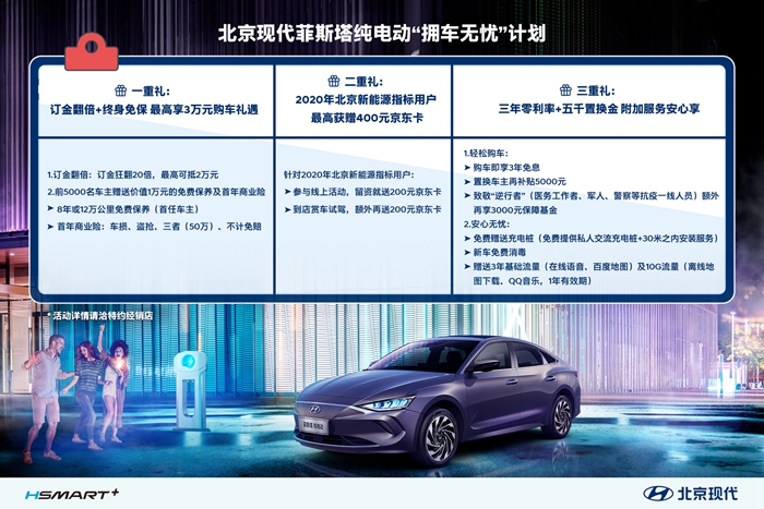 針對獲得2020年北京新能源指標(biāo)的準(zhǔn)車主,只要參與北京現(xiàn)代線上活動,留資并通過驗證即可直接獲得200元京東卡;注冊會員并到店賞車試駕,還可額外獲得200元的京東卡,累計價值400元。此外,消費(fèi)者還可享受3年免息政策,而對于置換用戶來說,還可在此基礎(chǔ)上獲得5000元置換補(bǔ)貼。特別值得一提的是,為致敬抗擊一線的“逆行者”,包括醫(yī)務(wù)工作者、軍人、警察等還可額外享受3000元保障基金。
