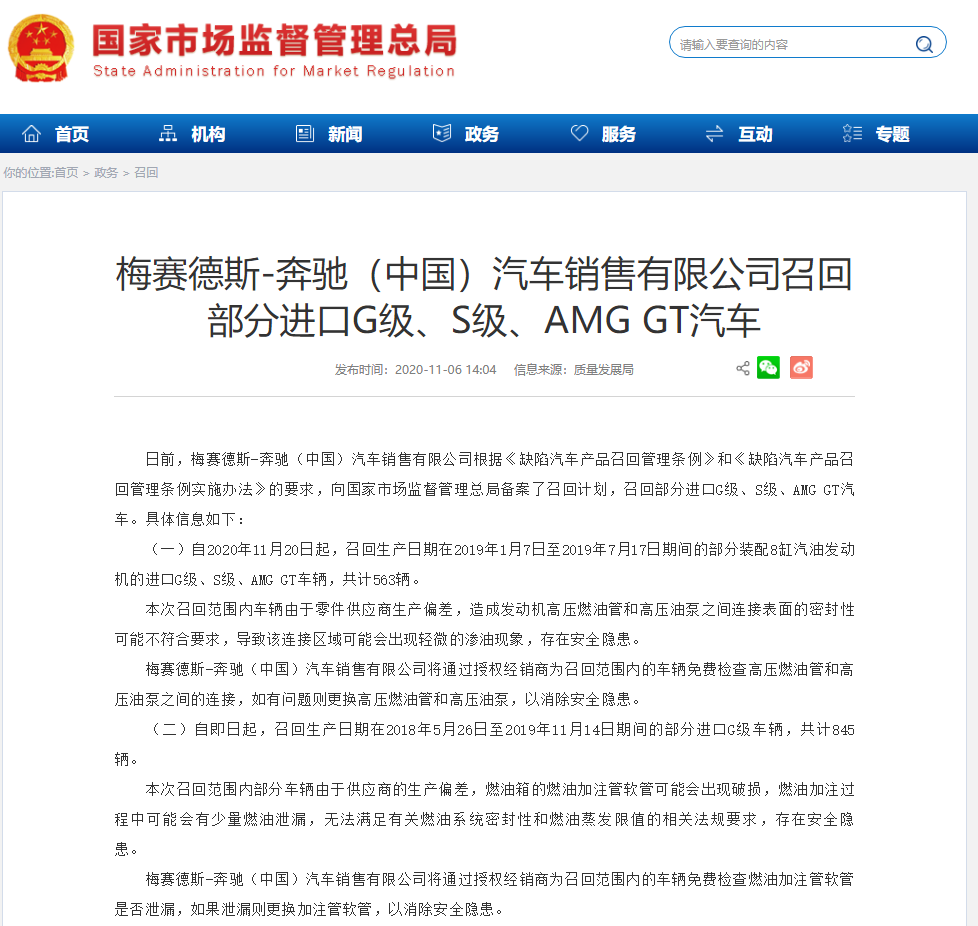 (一)自2020年11月20日起,召回生產(chǎn)日期在2019年1月7日至2019年7月17日期間的部分裝配8缸汽油發(fā)動機的進口G級、S級、AMG GT車輛,共計563輛。