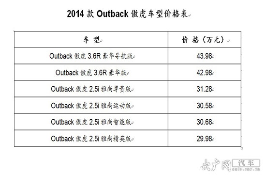 2014年1月11日,斯巴魯汽車(chē)(中國(guó))有限公司公布了2014款Outback傲虎的價(jià)格并宣布新車(chē)型從即日起在中國(guó)市場(chǎng)正式上市銷(xiāo)售。這款新車(chē)型通過(guò)更為精簡(jiǎn)合理的款型設(shè)置和外觀、內(nèi)飾方面的新增配置使性?xún)r(jià)比得到大幅提升,其價(jià)格區(qū)間為29.98~43.98萬(wàn)元。