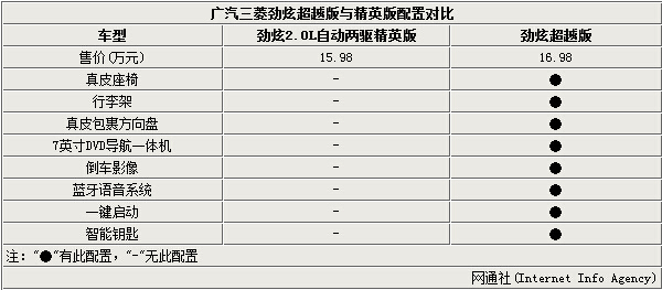 據(jù)廣汽三菱4s店工作人員透露,勁炫新增的超越版除擁有精英版所擁有的前后電動車窗、前霧燈以及后視鏡電動調(diào)節(jié)等常規(guī)外觀配置,和多功能方向盤、行車電腦顯示屏等內(nèi)飾配置,以及ABS防抱死系統(tǒng)、制動力分配系統(tǒng)之外,還在精英版基礎(chǔ)上新增了7英寸DVD導(dǎo)航一體機、倒車影像以及一鍵啟動等8項配置,但售價僅比目前的精英版高出1萬元。在性價比大幅提升的同時,該車也為消費者提供了更多的選擇性,該版本車型將在本月7日于北京上市。