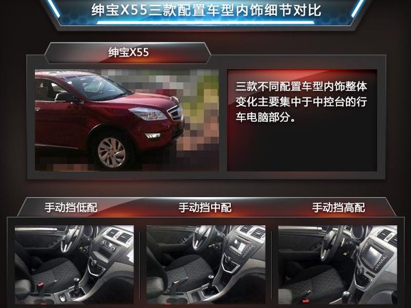 從我們所獲得的最新內(nèi)飾圖片中可以看出,紳寶X55所曝光的三款車型均為手動擋版本,內(nèi)飾以黑色和灰色作為主體色調(diào),網(wǎng)狀面料的前排座椅給人一種運(yùn)動感非常強(qiáng)的感覺。此外值得注意的是,X55低配車型為了拉低價格并沒有配備行車電腦屏幕,而中配車型和高配車型的區(qū)別是行車電子屏幕的尺寸不同,高配車型的屏幕更大一些。
