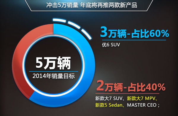 根據(jù)目前市場常規(guī)更新升級的時間來看,納智捷旗下5 Sedan和大7 MPV兩款產(chǎn)品已臨近小改款的周期,同時新款車型的推出也將有助于進一步提升產(chǎn)品的競爭力。據(jù)東風裕隆官方公布的最新數(shù)字:今年于6月初的優(yōu)6 SUV車型推出以來,至今訂單量已超過2萬。年內(nèi)僅優(yōu)6 SUV一款車型計劃完成3萬輛的銷量數(shù)字,占據(jù)60%的比例。其余在售的4款車型大7 SUV、大7 MPV、5 Sedan以及MASTER CEO將完成剩余40%的銷量數(shù)字。