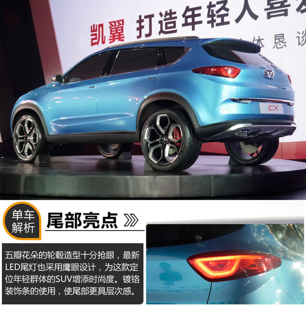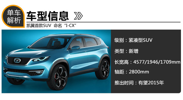 I-CX是凱翼品牌計劃推出的首款SUV,新車是基于科技互聯(lián)技術(shù),打造的一款緊湊級城市SUV,主要的消費人群定位在20-32歲的年輕一代,具有現(xiàn)代互聯(lián)產(chǎn)品的主要功能,可實現(xiàn)互聯(lián)駕駛、遠程控制、支持APP以及車輛自動監(jiān)測。其車身長寬高4577/1946/1709mm,軸距2800mm。更長的軸距也迎合了中國市場對于大空間的需求,將為消費者提供更大的后排空間。