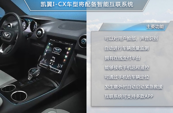 隨著互聯(lián)網(wǎng)在中國的發(fā)展,越來越多的汽車企業(yè)也把目光投向了汽車智能互聯(lián)。在今年成都車展上,一個主打智能互聯(lián)汽車的自主品牌——凱翼應(yīng)運而生。凱翼汽車總經(jīng)理鄭兆瑞表示:“凱翼將致力于打造年輕人喜愛的智能互聯(lián)汽車!背酥,凱翼品牌也發(fā)布了旗下首款SUV車型,定名為I-CX,并計劃于2015年正式上市銷售。