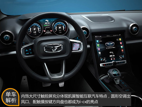 在內(nèi)飾方面,凱翼I-CX車型重點突出了科技感,采用大尺寸的觸控屏幕,在這一點上與特斯拉理念相似。除此之外,圓形空調(diào)出風口、配觸摸按鍵的方向盤以及炮筒式儀表盤,也都成為新車的亮點。此外,未來I-CX還將為用戶提供更多個性化的內(nèi)飾顏色,以及科技配置,讓消費者體會到駕駛中科技所帶來的便捷和樂趣。(網(wǎng)通社 2014年8月29日 成都報道)