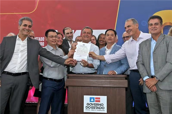 在巴伊亞州民政部長Bruno Dauster(后排中)的見證下,比亞迪巴西分公司總經理李鐵與巴伊亞州交通運營公司CTB主席José Eduardo Ribeiro Copello共同簽署整體設計方案合約