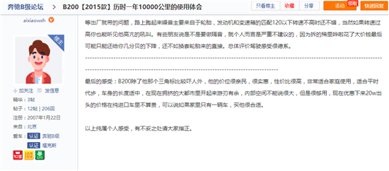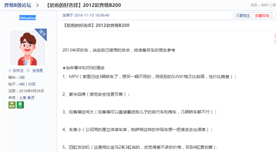 對(duì)于奔馳B級(jí),網(wǎng)友“SMwalnut”直接列出了自己看中它的理由:“1、MPV(家里已經(jīng)3輛轎車(chē)了,想買(mǎi)一輛不同的,同級(jí)別的SUV價(jià)格又比較高,性?xún)r(jià)比略差);2、豪華品牌(感覺(jué)安全性更可靠);3、后備箱空間大;4、車(chē)身。5、四缸發(fā)動(dòng)機(jī)”。網(wǎng)友“aixiaowxh”也表示,“B200的價(jià)位很親民,很實(shí)惠,性?xún)r(jià)比很高,非常適合家庭使用,適合平時(shí)代步,車(chē)身的長(zhǎng)度適中,在現(xiàn)在擁擠的大都市里開(kāi)起來(lái)游刃有余,內(nèi)部空間不能說(shuō)很大,但是很夠用……如果家里只有一輛車(chē),買(mǎi)它很合適”。