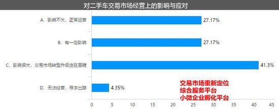 流通協(xié)會(huì)同時(shí)指出,政策對(duì)傳統(tǒng)二手車市場(chǎng)經(jīng)營(yíng)模式將帶來(lái)巨大沖擊,并倒逼二手車交易市場(chǎng)轉(zhuǎn)型升級(jí)。調(diào)查中,有41.3%的經(jīng)營(yíng)主體認(rèn)為“受政策影響,二手車交易市場(chǎng)轉(zhuǎn)型升級(jí)迫在眉睫”。羅磊建議,傳統(tǒng)二手車經(jīng)營(yíng)模式需要向綜合服務(wù)平臺(tái),小微企業(yè)孵化平臺(tái)轉(zhuǎn)變,經(jīng)營(yíng)主體應(yīng)對(duì)交易市場(chǎng)進(jìn)行重新定位。