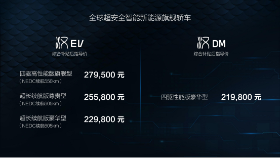 其中,漢EV超長續(xù)航版豪華型和漢EV超長續(xù)航版尊貴型NEDC綜合工況純電續(xù)駛里程為605公里;漢EV四驅(qū)高性能版旗艦型百公里加速3.9秒,是中國加速最快的量產(chǎn)新能源轎車;漢DM四驅(qū)性能版豪華型百公里加速4.7秒,是中國加速最快的插電混動轎車。