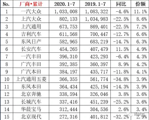 另外從1-7月累計銷量上看,前15家車企當(dāng)中,合資品牌占比達三分之二,一汽-大眾、上汽大眾包攬前二。