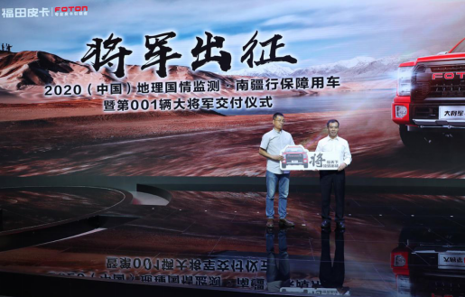 與此同時,福田皮卡大將軍也迎來了它的首位車主,并由北汽集團總經(jīng)理、北汽福田董事長張夕勇將車鑰匙正式交付中國自然資源部第二地形測量隊。即日起,這臺剛一面市的福田皮卡大將軍將承擔(dān)起丈量南疆陸地國境線,勘測地理地貌的神圣莊嚴(yán)任務(wù)。古時,將軍戍邊衛(wèi)國;而在今天,福田皮卡大將軍第一個任務(wù)也是憑借其突出的全天候、全地形適應(yīng)能力征戰(zhàn)南疆、保衛(wèi)國土,其中寓意讓人感慨贊嘆。