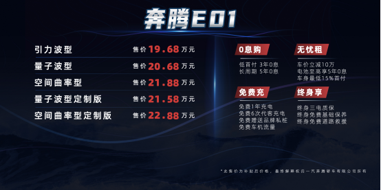 奔騰E01誕生于中國一汽全新的純電動(dòng)FME架構(gòu),自8月亮相和啟動(dòng)盲訂至今,作為一汽奔騰正向研發(fā)的“超感觸控純電SUV”,憑借輕質(zhì)未來的設(shè)計(jì)、無極觸控的智能、超感環(huán)保的舒適及超前臻享的性能等優(yōu)勢(shì),備受用戶關(guān)注和期待。奔騰E01今天正式上市,提供5種版本,滿足用戶的多樣化選擇需求,補(bǔ)貼后售價(jià)為19.68-22.88萬元。