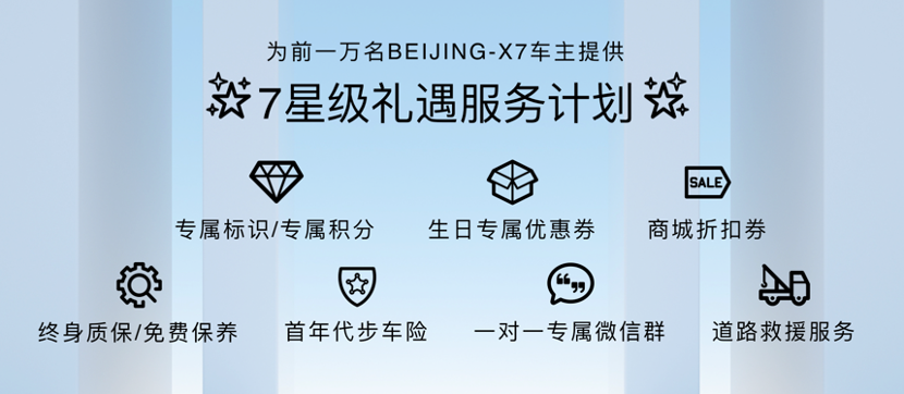 發(fā)布會(huì)當(dāng)日,BEIJING汽車發(fā)布面向首批一萬(wàn)名BEIJING-X7車主的“七星級(jí)禮遇服務(wù)計(jì)劃”,以線上的尊榮特權(quán)和線下的無(wú)憂守護(hù),回饋車主信賴。