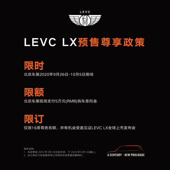 在北京國(guó)際車展期間,LEVC與羅倫士首款聯(lián)名車型LX開啟限量預(yù)售活動(dòng),用戶可通過在車展現(xiàn)場(chǎng)支付5萬元進(jìn)行搶訂,LEVC品牌將匹配出LEVC LX全球首批16席購(gòu)車名額。而通過限時(shí)、限量、限定層層篩選的16位準(zhǔn)車主,還有機(jī)會(huì)受邀至LEVC LX全球首發(fā)上市發(fā)布會(huì)現(xiàn)場(chǎng),并見證首批車主尊享交車儀式。